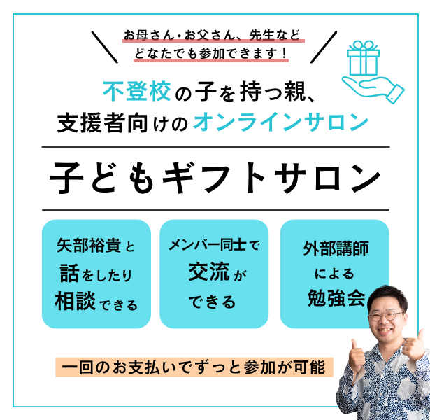 会員は、不登校の子を持つ親、支援者等、当サロンの趣旨に賛同した者とします。